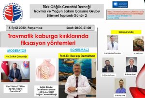 Türk Göğüs Cerrahisi Derneği Travma ve Yoğun Bakım Çalışma Grubu Bilimsel Toplantı Günü- 2 – 15 Eylül 2022 epikman 15 Eylül 2022 Geçmiş Toplantılar Zoom adresi: https://serenaslive.zoom.us/j/89832851121?pwd=MVNqc3dJS2JIKzFEUmpqVVE0Wk9BZz09 Toplantı kimliği: 898 3285 1121 Parola: 150922