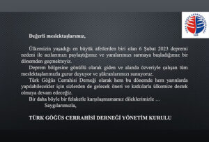 Değerli Meslektaşlarımız, Türk Göğüs Cerrahisi Derneği’nin Olağan Üstü Genel Kurul Toplantısı şubelerin açılması için Yönetim Kurulu’na yetki verilmesi gündemiyle 23 Eylül 2023 tarihinde saat 09:00’da…